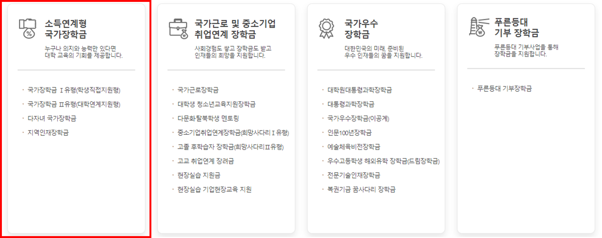 일반적으로 한국장학재단에서 지원하는 장학금 종류는 아래의 그림과 같이 4종류가 있지만