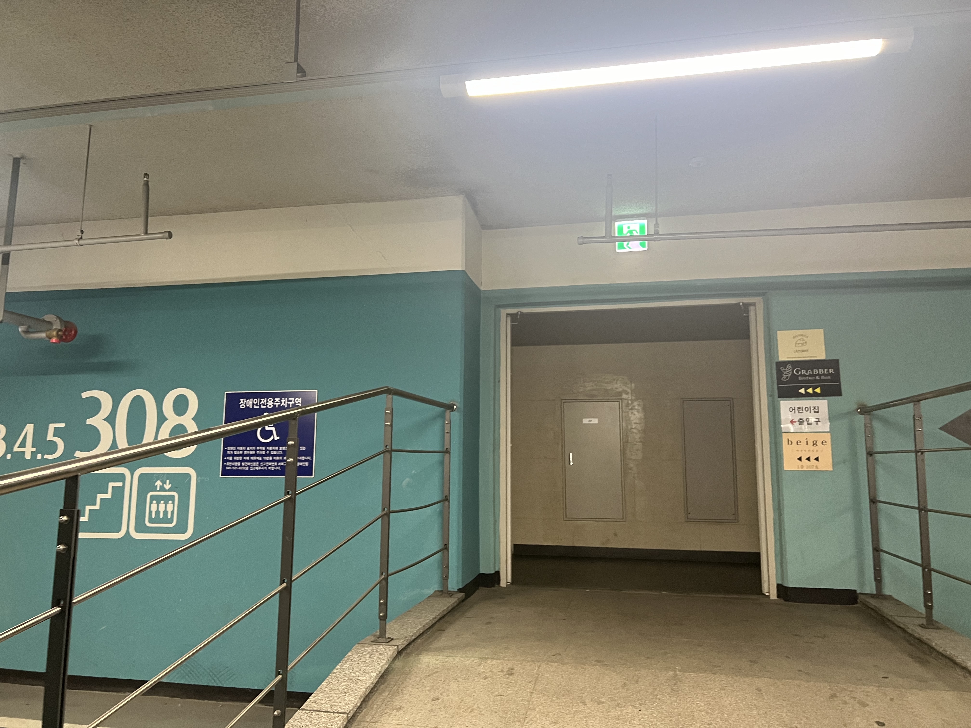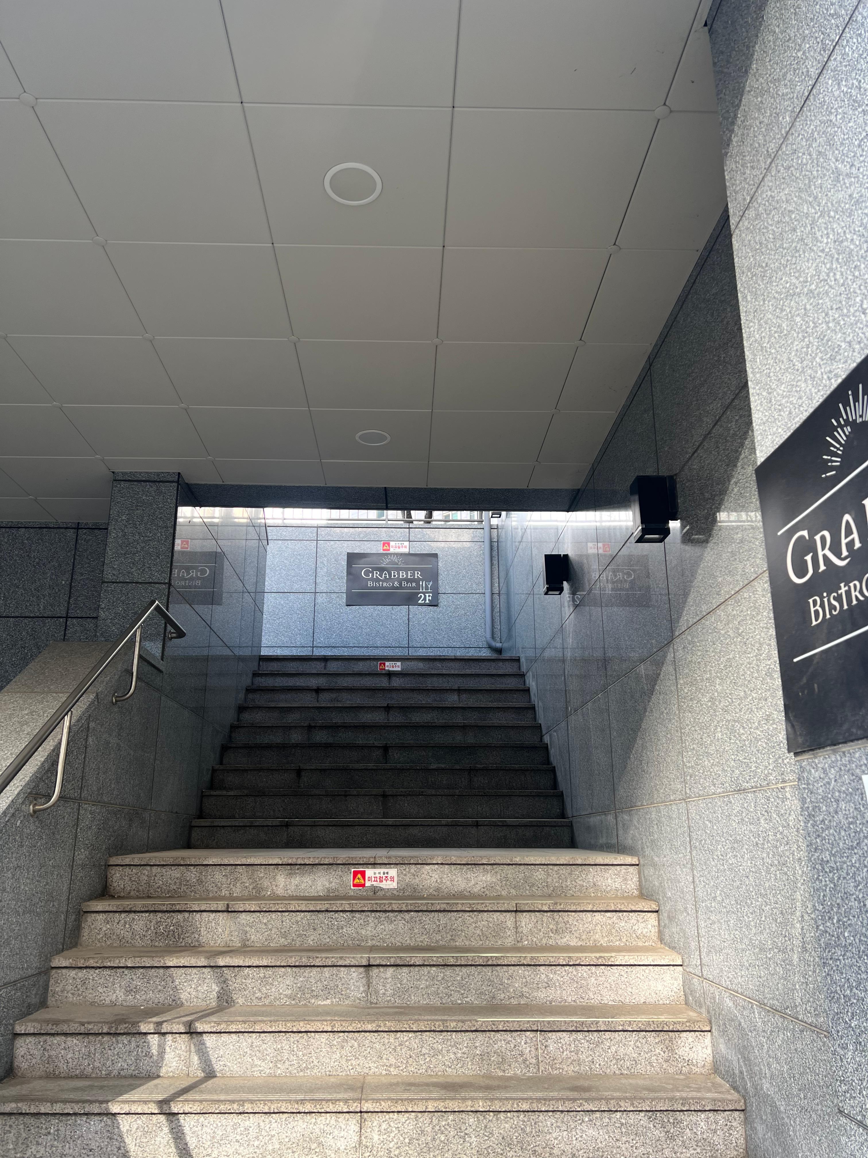 그래버 바가 위치한 상가 2층에 가기 위해서는 주차장 입구 옆에 있는 엘리베이터를 타시거나 그 옆의 계단을 이용하시면 됩니다. 참고로 그 옆에 상가 화장실도 위치하고 있습니다.