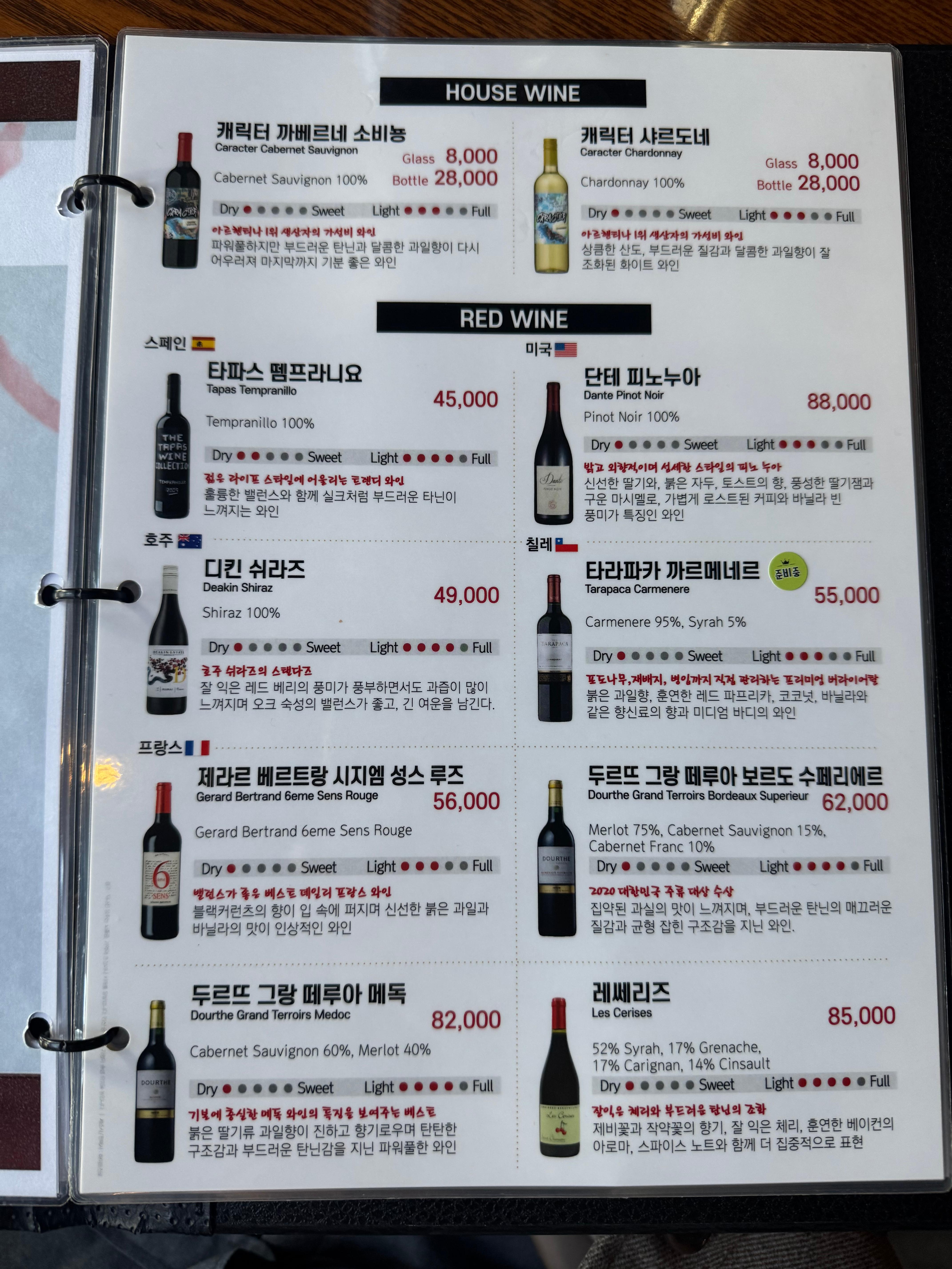 불당와인 맛집답게 다양한 종류의 와인과 더불어 위스키 칵테일 그 외 주류들이 구비되어 있는데요~ 주류 메뉴판만 봐도 술에 진심인 것을 알 수 있습니다.