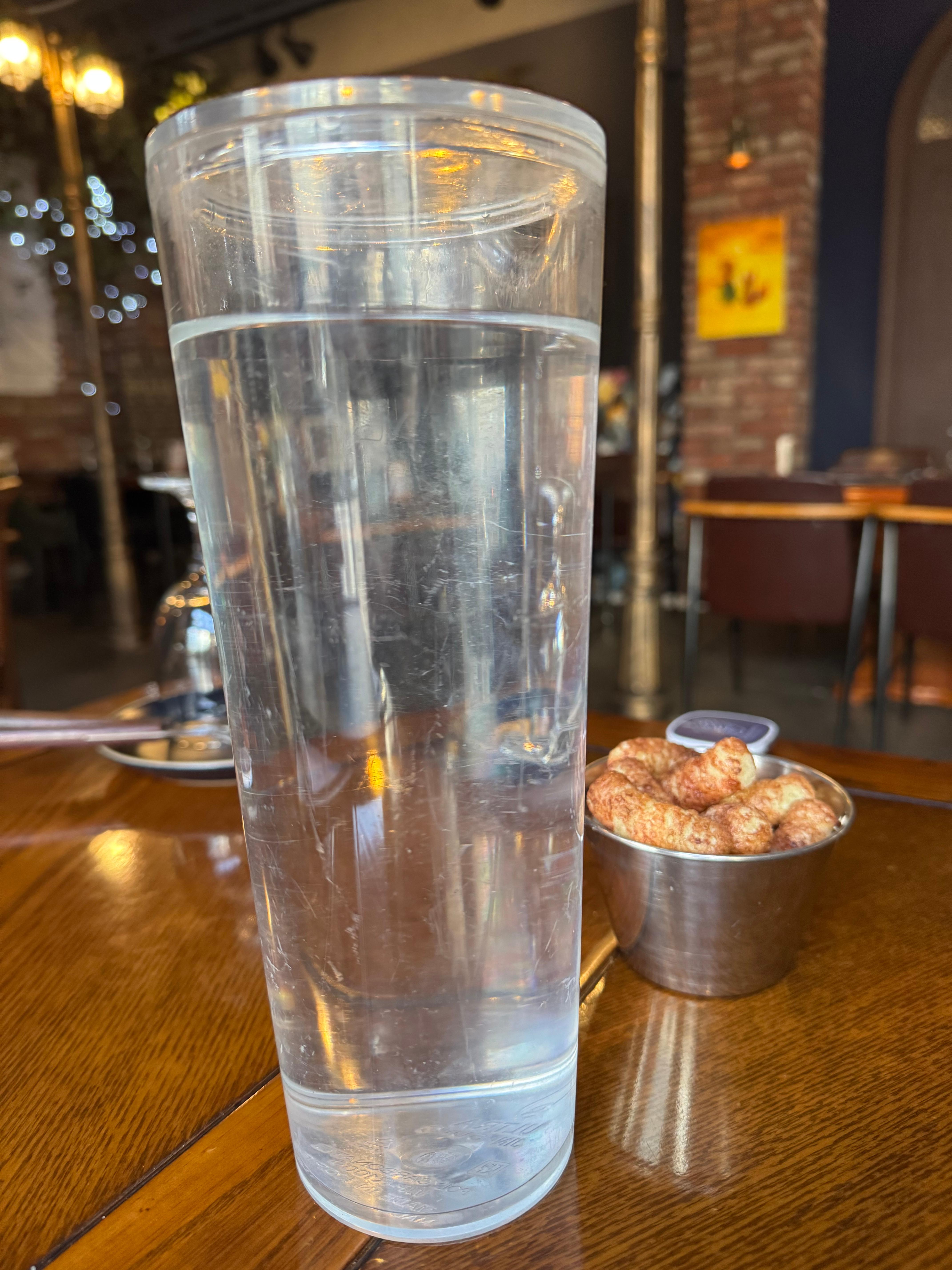 자리에 앉으시면 물과 함께 간단한 과자 안주(바나나킥 모양의 카라멜킥)가 기본으로 나옵니다. 과자를 집어드시면서 메뉴판을 보며 주문하시면 입이 심심하지 않습니다.