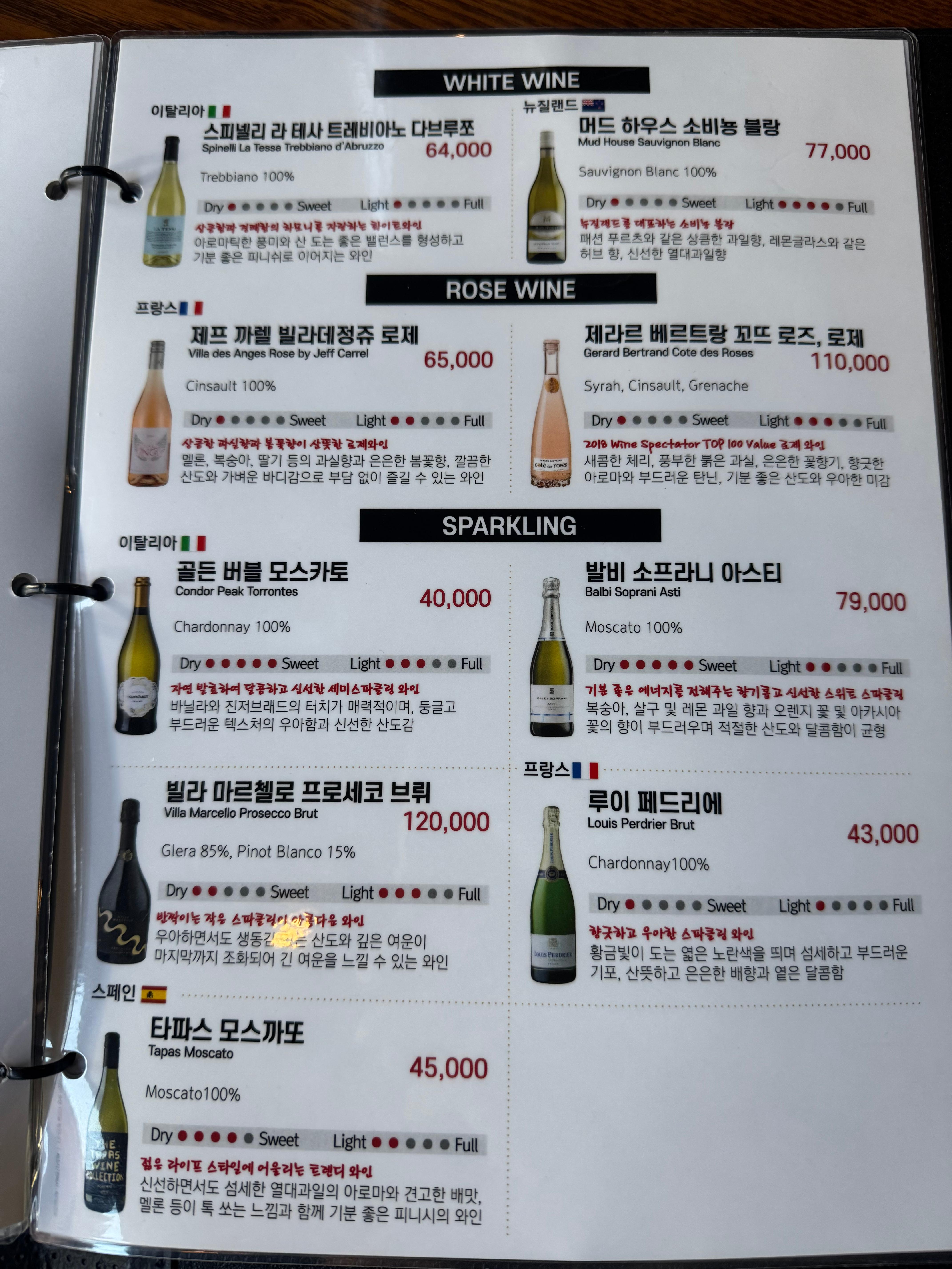 당일은 달달한 모스카토가 땡겨서 모스카토를 주문했습니다. 스페인 모스카토는 처음이었는데 총평은 데일리 와인처럼 가볍게 마시기에는 맛있고 좋았습니다.