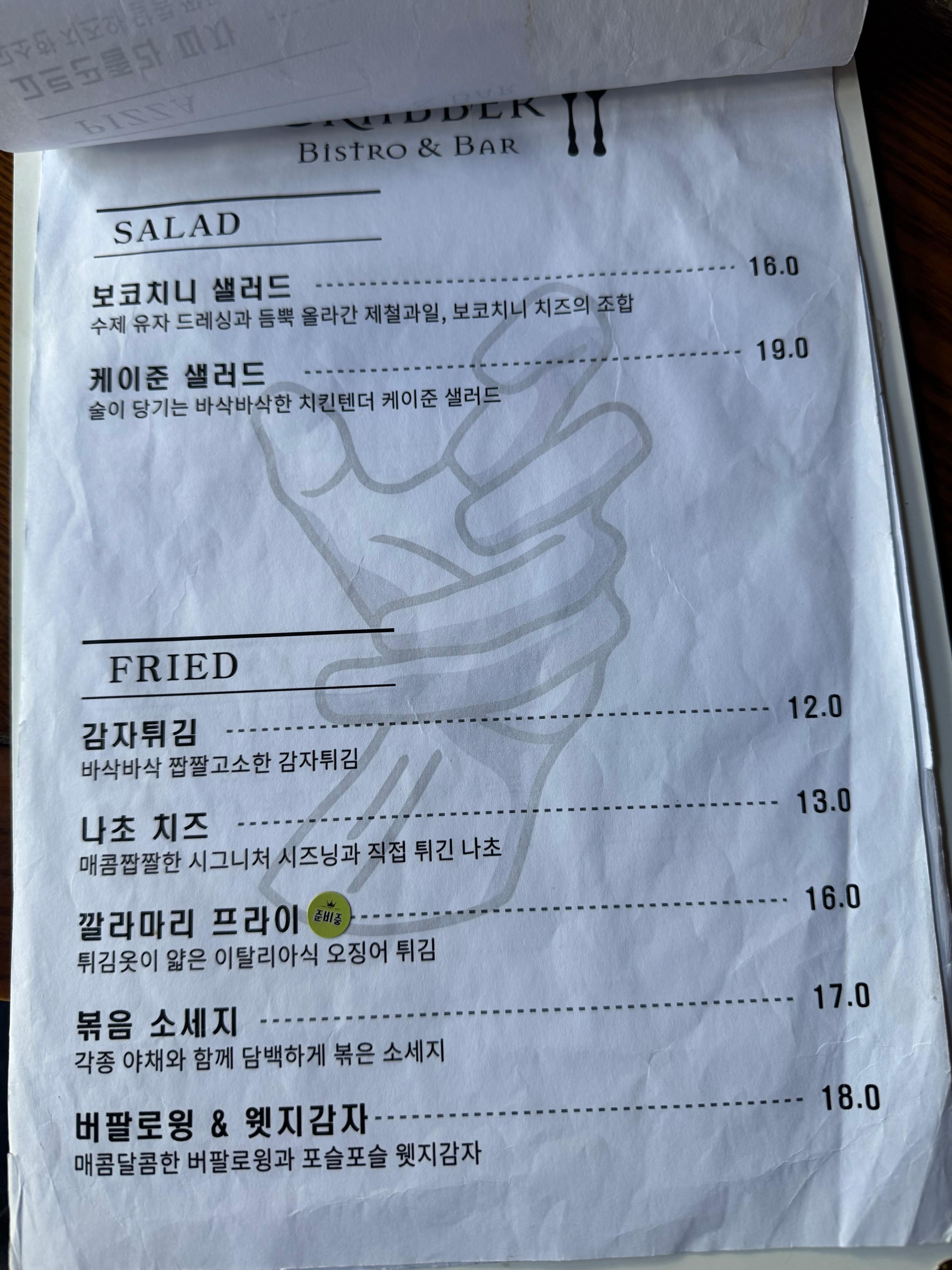 간단한 안주뿐만 아니라 와인과 잘 어울리는 파스타, 스테이크 같은 식사류도 같이 판매하고 있습니다. 주류도 와인을 메인으로 밀고 있지만, 와인뿐만 아니라 각종 칵테일들과 위스키도 구비하고 있으며 심지어 소주와 맥주도 있습니다.