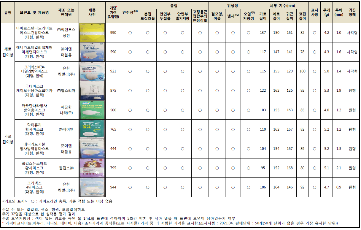보건용 마스크는 미세먼지 차단과 코로나19와 같은 감염병 예방을 위한 전국민의 필수 위생용품으로 자리 잡고 있습니다. 이에 시중에 판매되고 있는 일회용 마스크 (KF94 마스크)에 대한 품질 비교 시험을 실시하여 객관적인 소비자 선택 정보를 제공하고자 합니다.