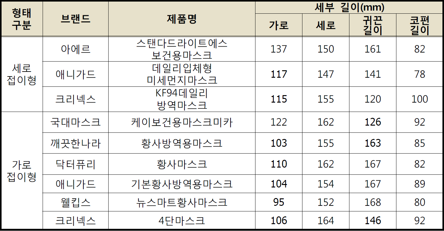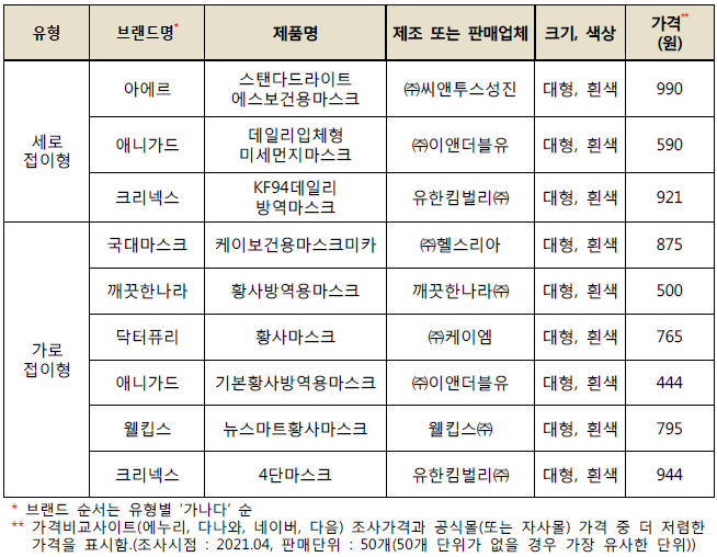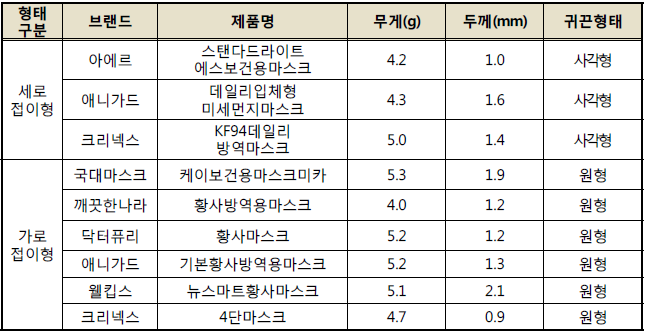 마스크 시험 대상 브랜드 및 제품 선정
