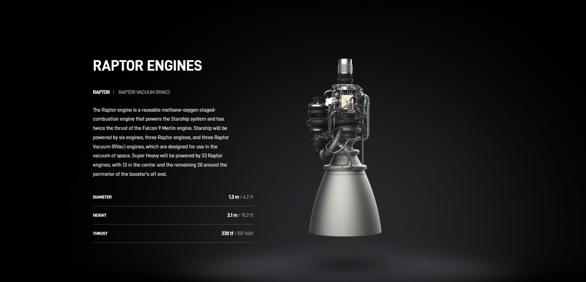 스타십을 위한 전용 엔진으로, 대기권 밖 우주공간에서 최대의 효율을 내는 전유량 다단 사이클 연소 엔진(FFSC, Full-Flow Staged Combustion)으로 개발되었습니다.추진체로는 메탄과 액화 산소를 사용합니다.