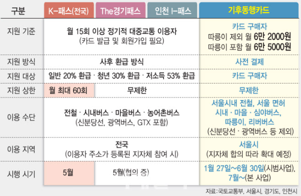 ※ 신규 이용자는 K- (korea-pass.kr)이나 모바일 어플리케이션 또는 11개 카드사의 누리집을 통해 원하는 교통카드 상품을 골라 패스를 이용할 수 있음(신한, 하나, 우리, 현대, 삼성, 국민, 농협, 티머니, 이동의즐거움, DGB 유페이)