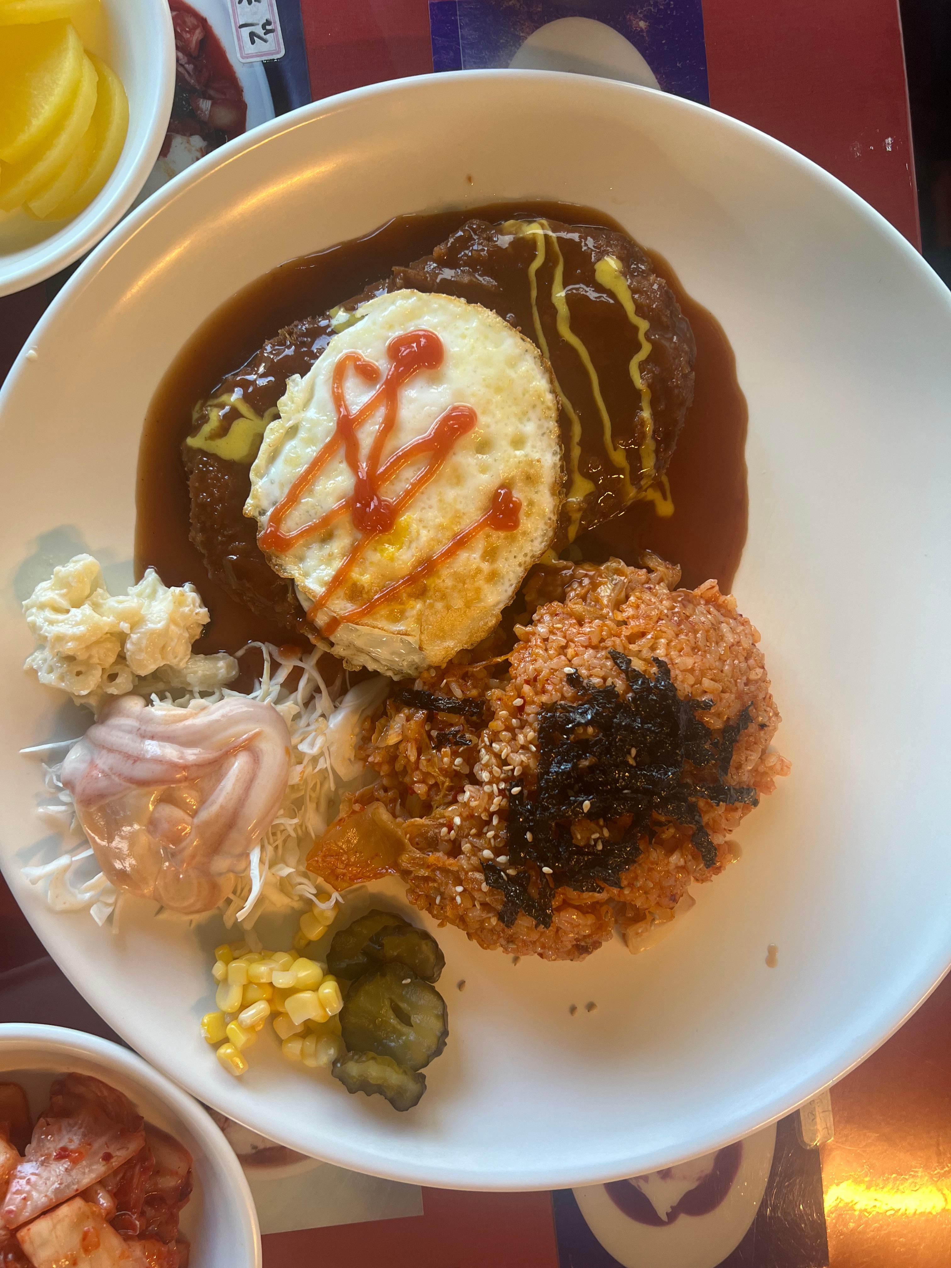 옛날 경양식 돈까스 형식으로 나오면서 계란후라이가 올라가 있다는 특징이 있습니다.