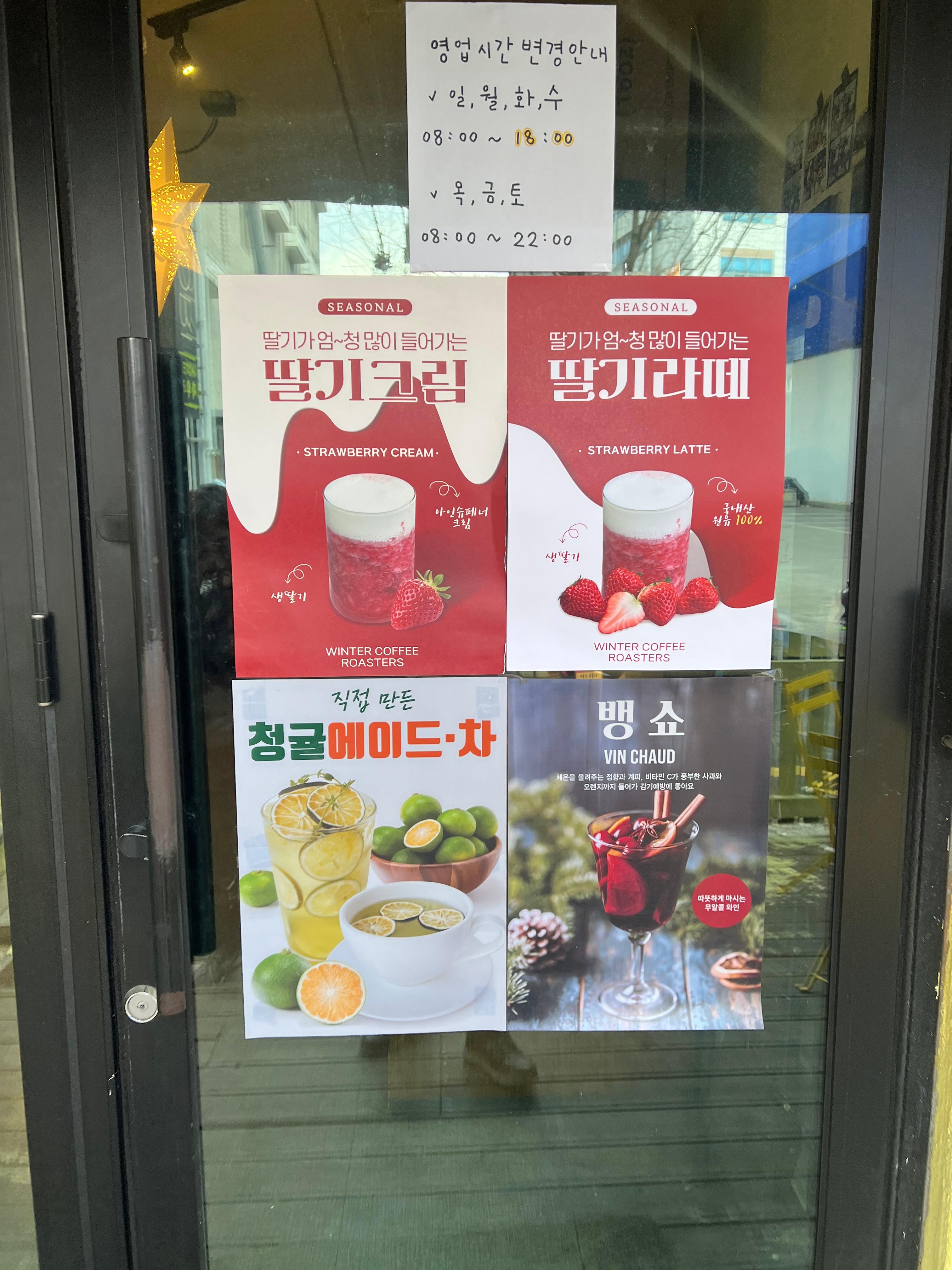 입구에는 영업시간과 최근 밀고 있는 듯한 음료들의 포스터가 붙어있습니다. 딸기와 뱅쇼로 미뤄봤을 때 겨울시즌 메뉴인 것 같습니다.