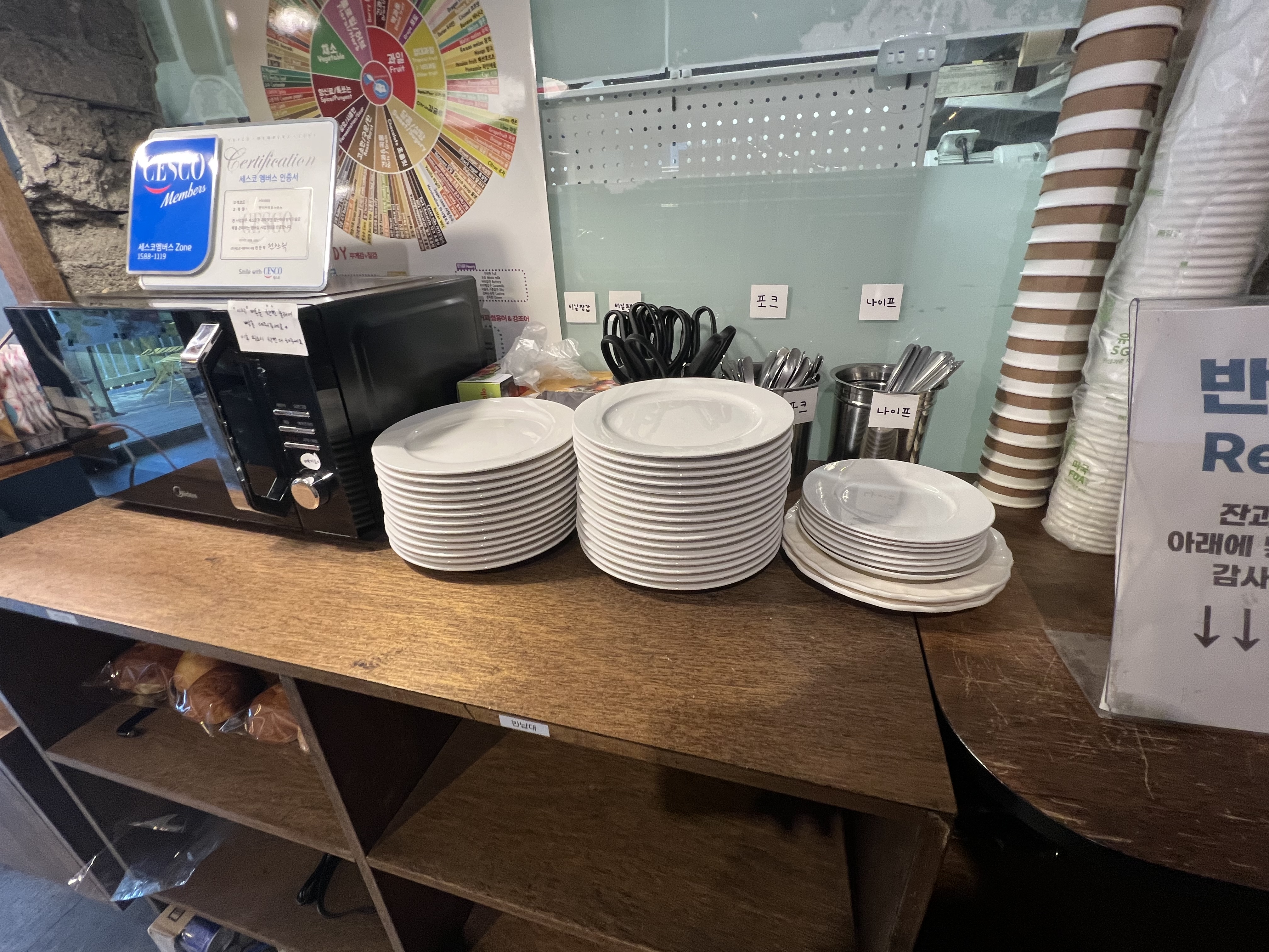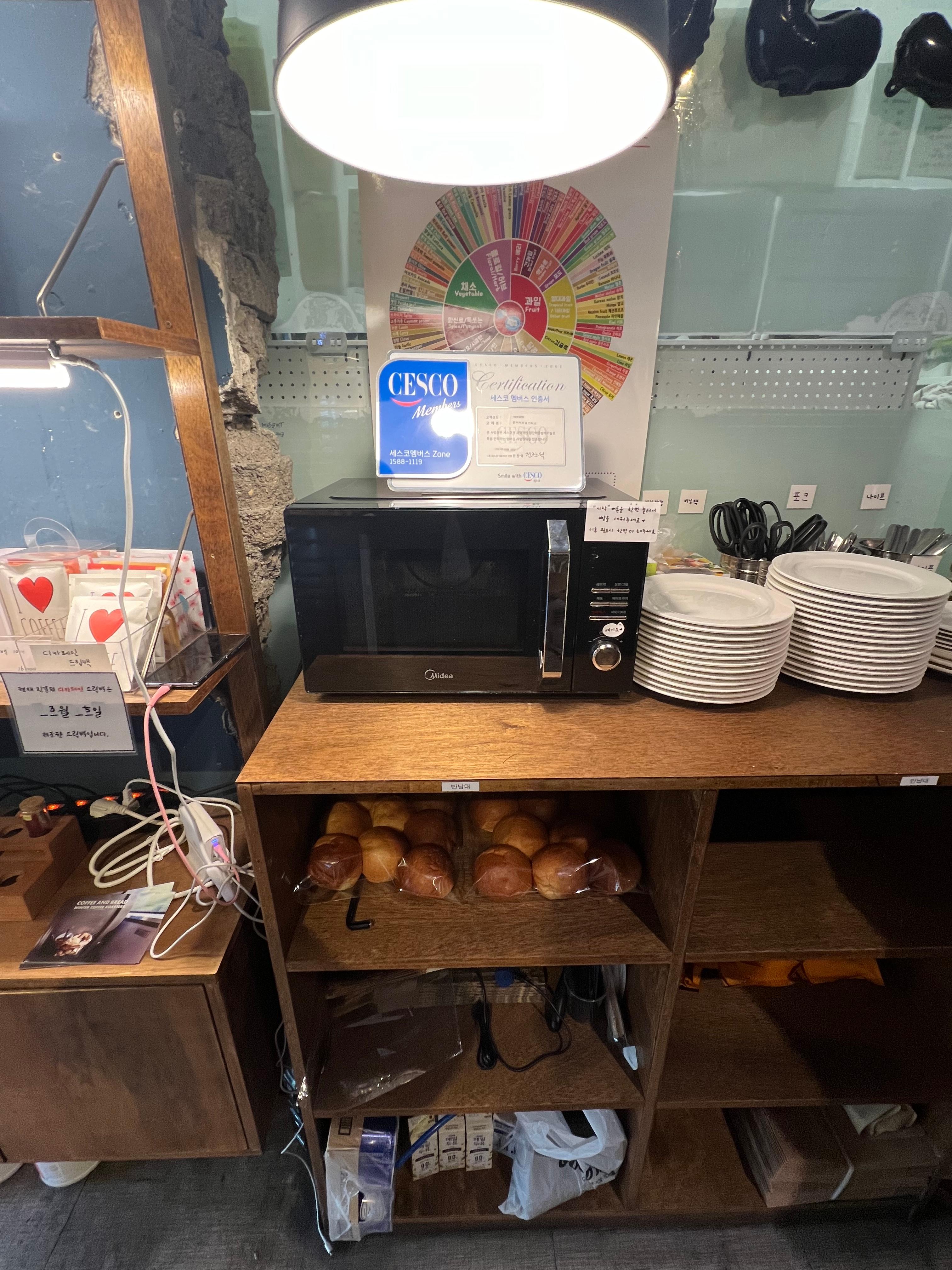 계산대 옆으로는 빵을 덥혀 먹을 수 있는 전자레인지가 있었습니다. 그리고 접시와 포크 나이프 등이 있었고, 그 외 이용가능한 집기류들이 있었습니다.