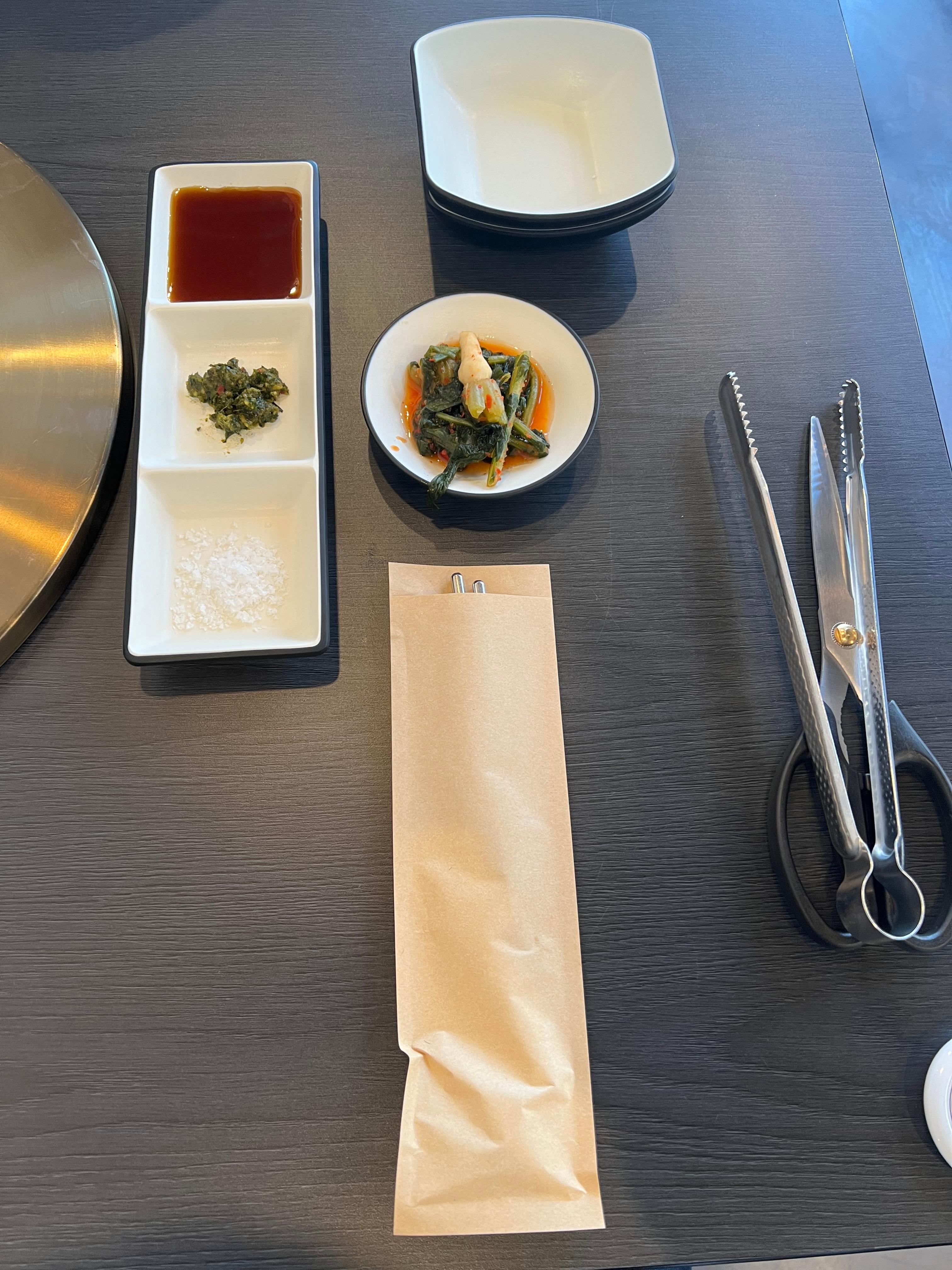 주문하시고 잠시 기다리시면 직원분이 기본 상차림을 차려주시는데요~ 수저와 고기집게와 가위 그리고 밑반찬들입니다.