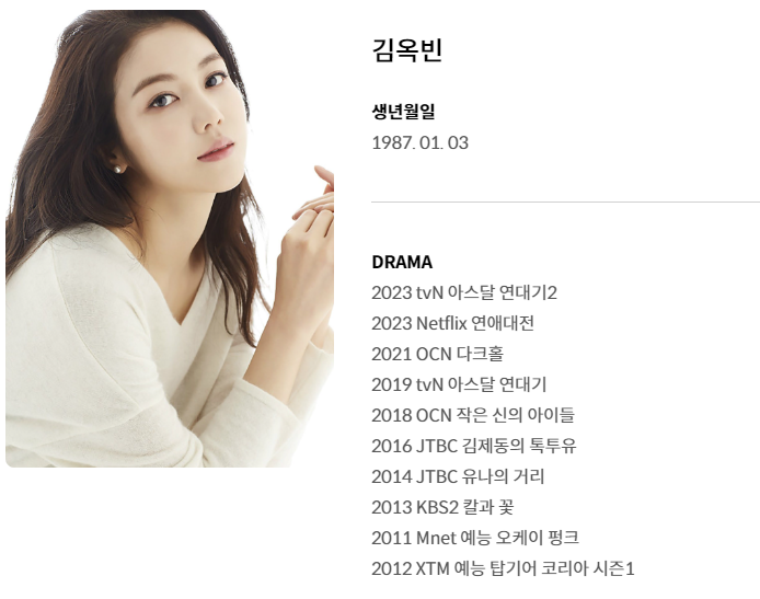 배우 김옥빈은 순천에서 1987년 1월 03일에 태어났습니다. 2005년 SBS 드라마 하노이 신부에서 주연을 맡으며 연기를 시작했습니다. 주요 연기 작품으로는 영화 다세포소녀, 박쥐, 악녀 등이 있으며 드라마 작품으로는 오버 더 레인보우, 칼과 꽃, 아스달 연대기, 아라문의 검 등이 있습니다.