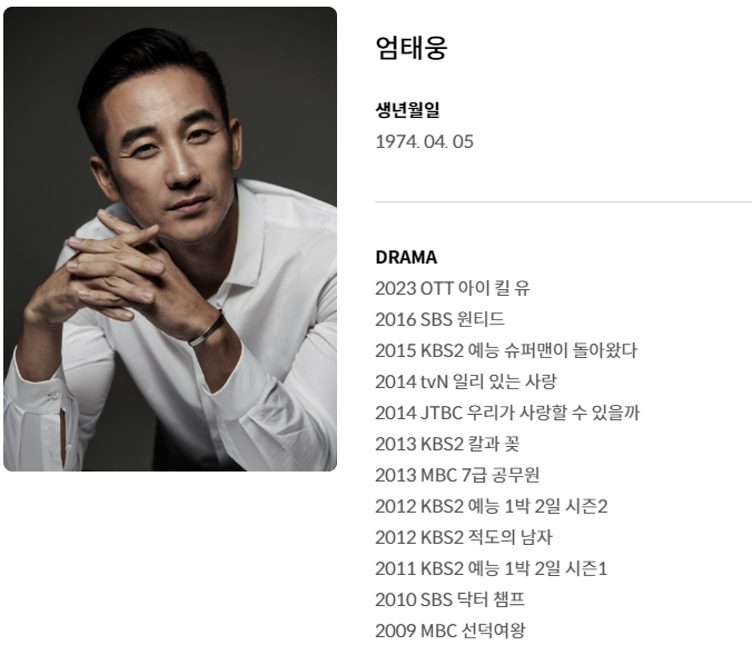 배우 엄태웅 제천에서 1974년 4월 05일에 태어났습니다. 1998년 영화에 단역으로 출연하며 영화에 데뷔하였으며 2005년 드라마 쾌걸 춘향에서 인기를 얻기 시작했습니다. 주요 연기 작품으로는 영화 실미도, 시라노 연애조작단, 특수본, 건축학개론 등이 있으며 드라마 작품으로는 쾌걸춘향, 선덕여왕, 칼과 꽃, 원티드 등이 있습니다.