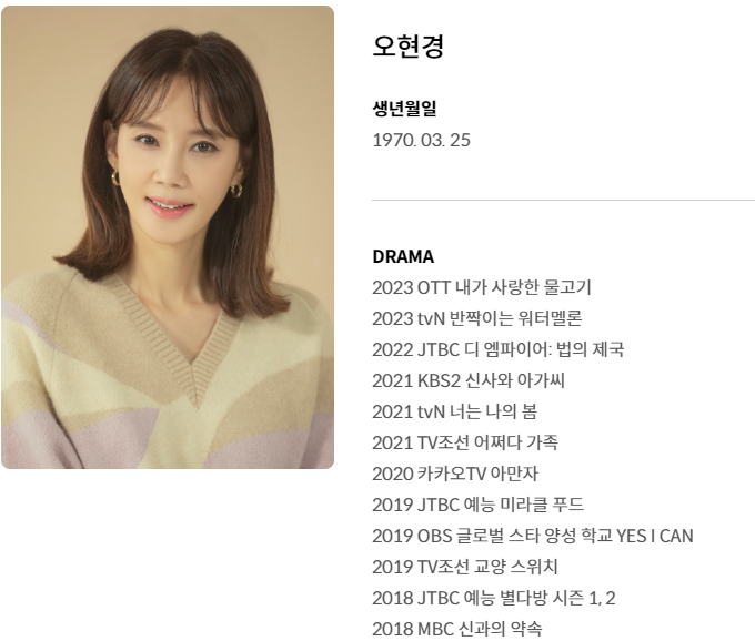 배우 오현경은 서울에서 1970년 3월 25일에 태어났습니다. 1988년 KBS 드라마 사랑이 꽃피는 나무로 데뷔하였으며 1989년 제 33회 미스코리아에서 진으로 선발되었습니다. 주요 연기 작품으로는 드라마 야망의 불꽃, 조강지처 클럽, 미녀 공심이, 수지 맞은 우리 등이 있습니다.